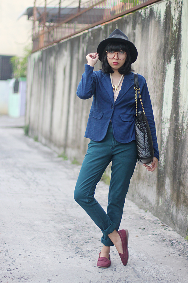 Androgyny. Dressy without dress. yes. Androgynous is the answer. I'm wearing Navy Blazer from Details, it has elegant cut, that's why i'm in love with it from the first sight , and dark green pants from American Jeans. I love the combination between these stuff. it makes a really cool combo. Of course the maroon loafers will make the color palette more awesome. Been searching these kind of loafer for ages, and i got it from Connexion" . And didn't forget to put on my recent favorite hat. :)